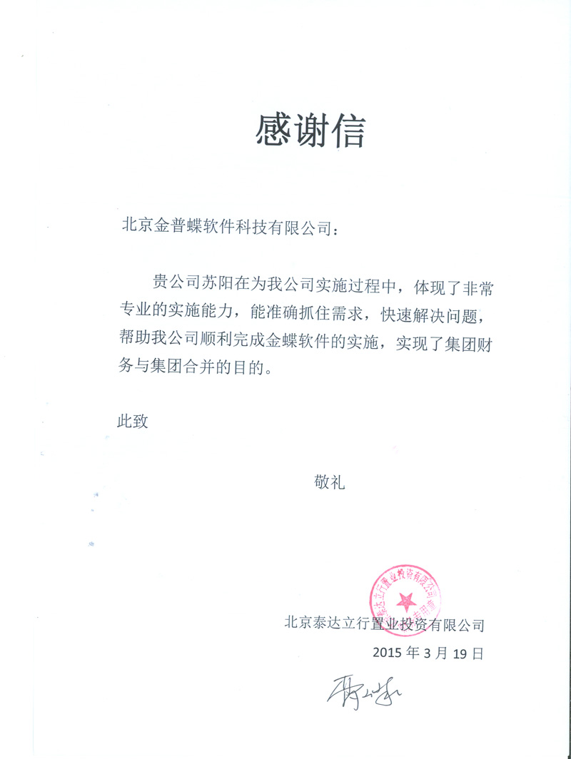 北京泰達(dá)立行置業(yè)投資有限公司的感謝信