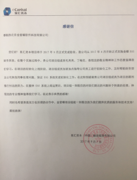易匯資本(中國(guó))融資租賃有限公司的感謝信